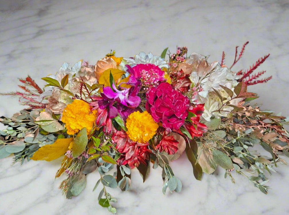 Celebrate the warmth of Thanksgiving with this elegant autumn arrangement. Season of Thanks brings together rich golden hues, rustic oranges, and deep burgundy blooms that capture the beauty of fall.