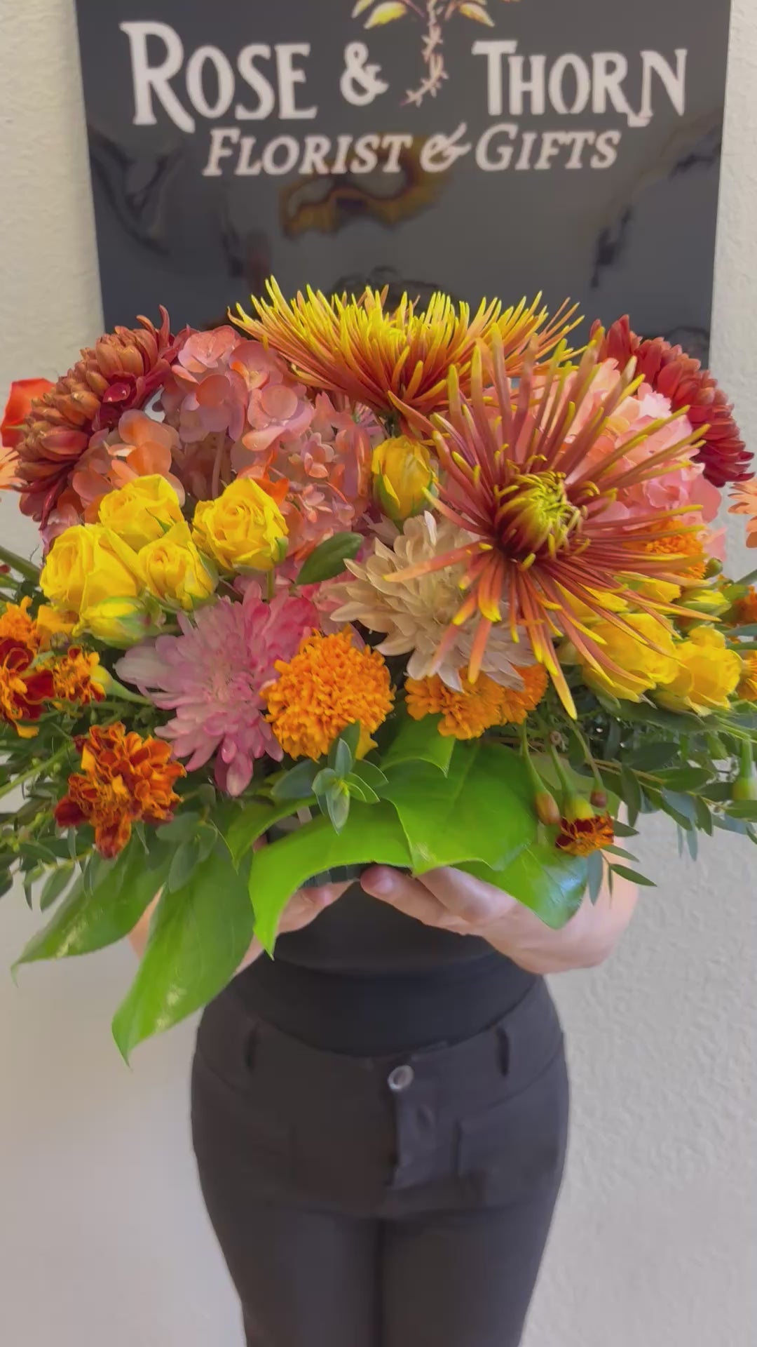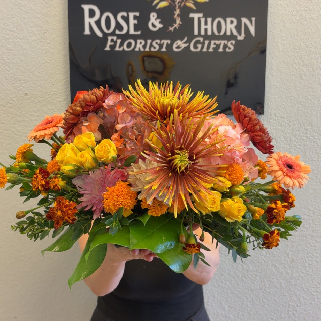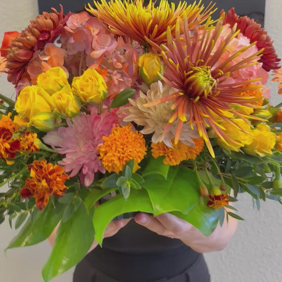Illuminate your holiday table with Thanksgiving Glow — a rustic centerpiece that captures the warmth and gratitude of the season. Golden blooms, autumn foliage, and softly glowing accents come together to celebrate the beauty of harvest time