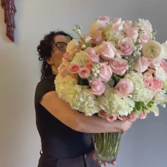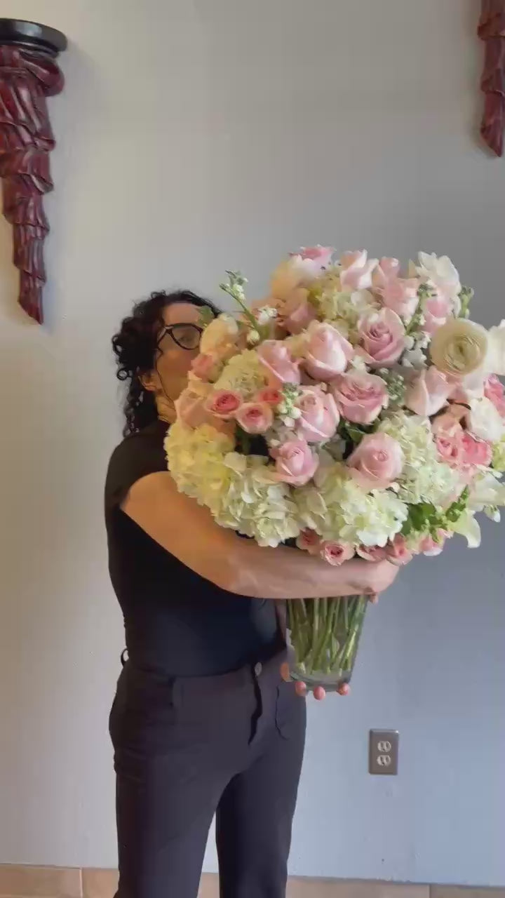 Wrap your loved one in soft sophistication with the Luxurious Love Bouquet: Blushing Elegance. This dreamy arrangement features a tender mix of blush roses, pale pink and creamy , delicately nestled among soft eucalyptus and textured greenery. Housed in an elegant , it exudes timeless romance