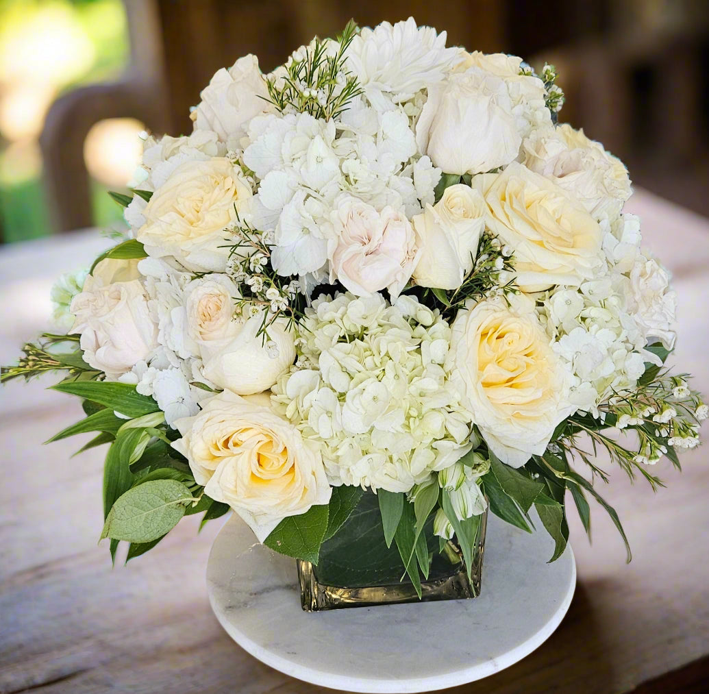 A timeless composition of pristine white blooms that embodies grace, sophistication, and refined beauty. Pure Elegance features a harmonious blend of ivory roses, white roses and white soft hydrangeas, delicately accented with lush greenery.