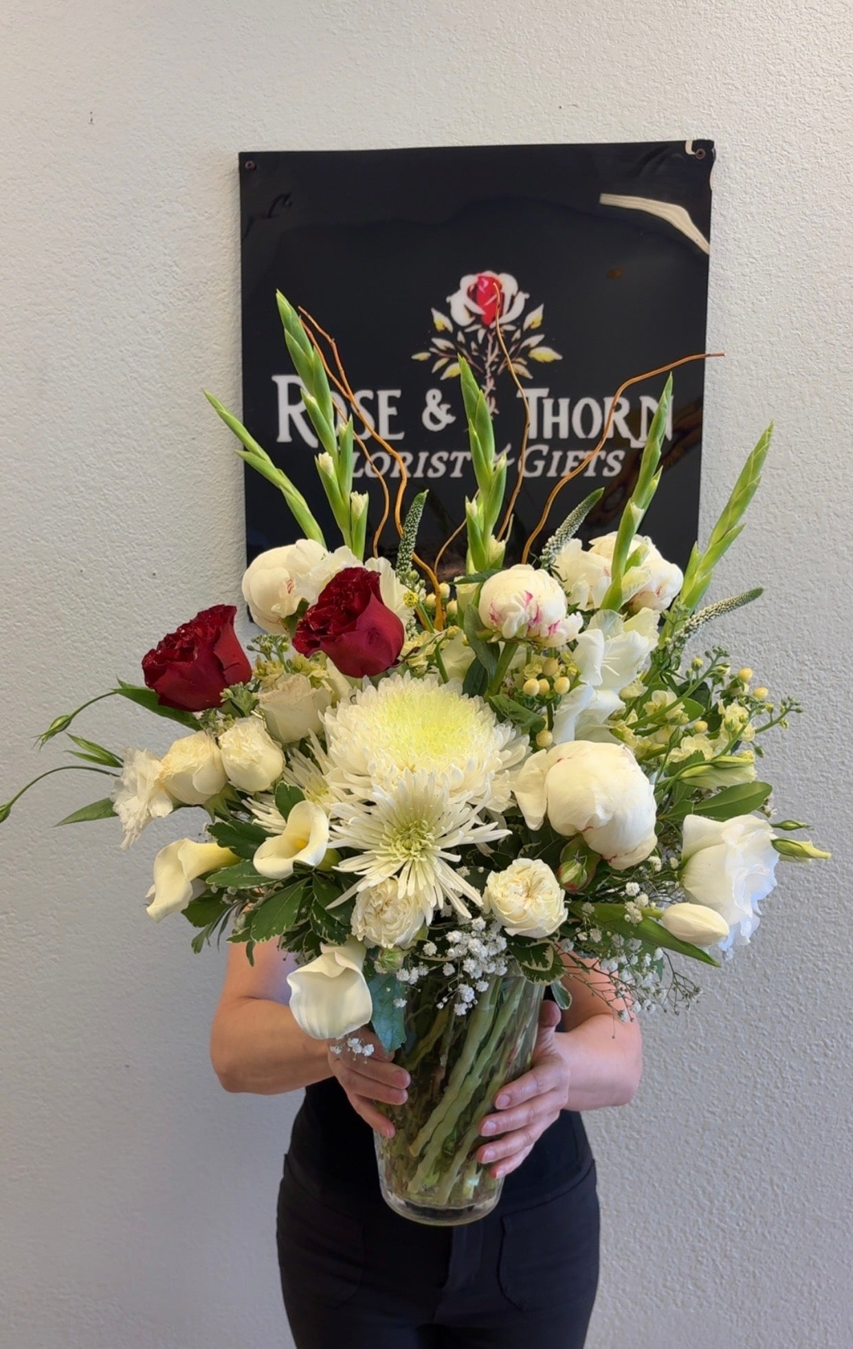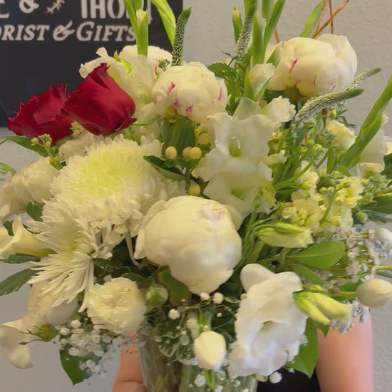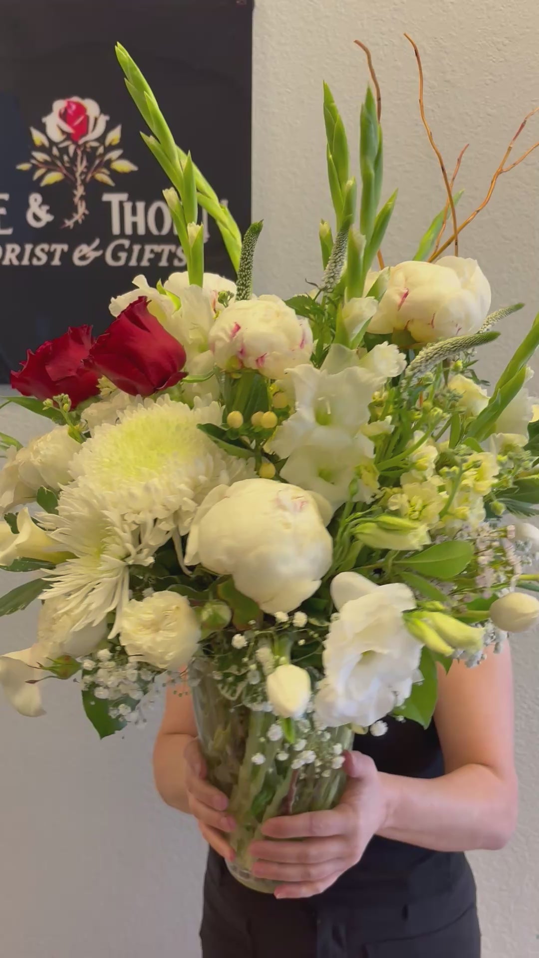 In some instances, our photo may represent an overall theme or look and include a one-of-a-kind vase which cannot be exactly replicated. Although the actual bouquet may not precisely match the photo, its temperament will. Occasionally, substitutions of flowers and/or containers happen due to weather, seasonality and market conditions which may affect availability. If this is the case with the gift you’ve selected, we will ensure that the style, theme and color scheme of your arrangement is preserved and will only substitute items of equal value or higher value. If any design elements are of major importance to your order, please include them in the florist instructions at checkout or contact us to ensure availability.