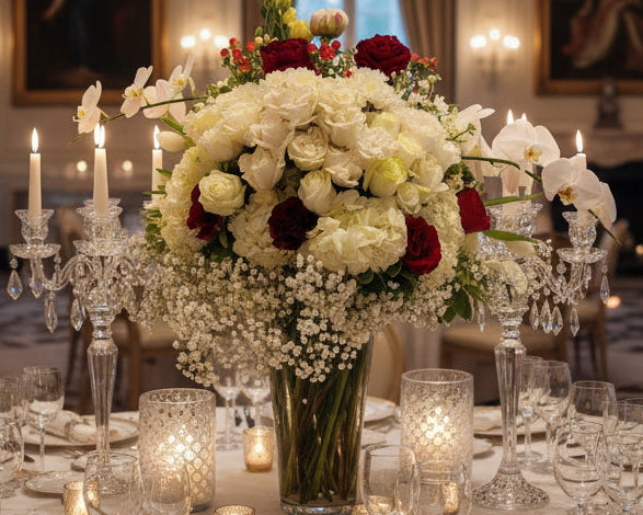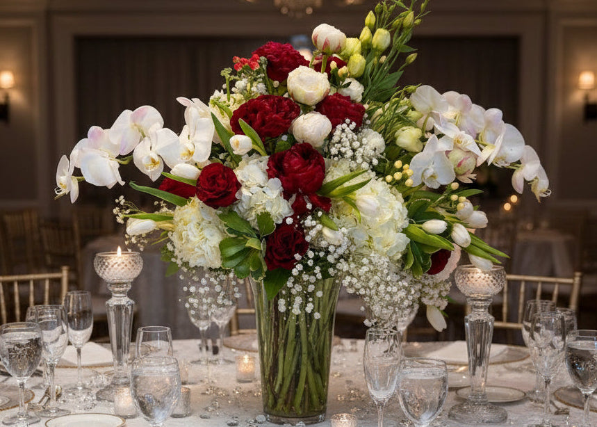 A bold and lavish arrangement overflowing with ruby-red blooms, white orchid accents, red and white roses, and deep scarlet highlights, beautifully paired with lush festive greenery. This luxurious design layers rich Christmas reds with elegant contrasts, adding a royal touch to your holiday dΓ©cor while radiating warmth, depth, and timeless holiday elegance.
