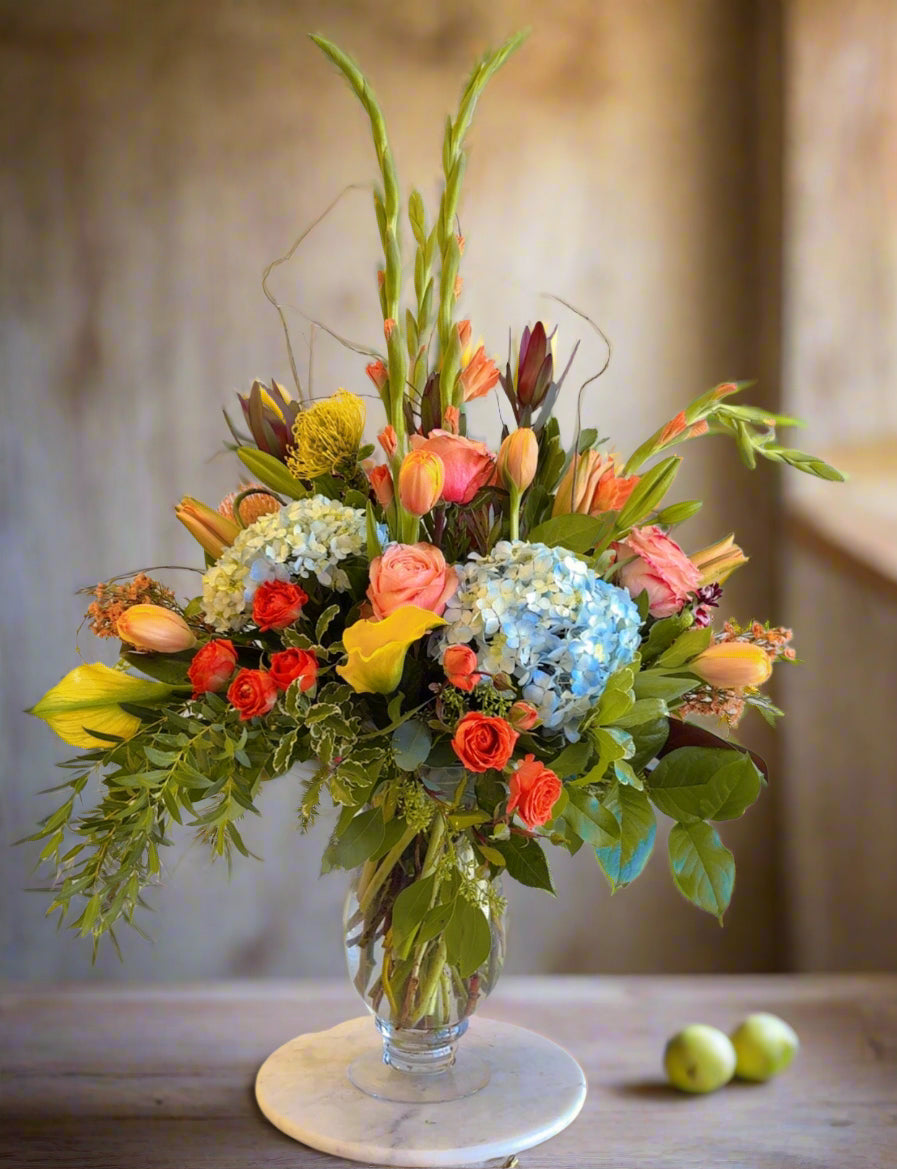 In some instances, our photo may represent an overall theme or look and include a one-of-a-kind vase which cannot be exactly replicated. Although the actual bouquet may not precisely match the photo, its temperament will. Occasionally, substitutions of flowers and/or containers happen due to weather, seasonality and market conditions which may affect availability. If this is the case with the gift you’ve selected, we will ensure that the style, theme and color scheme of your arrangement is preserved and will only substitute items of equal value or higher value. If any design elements are of major importance to your order, please include them in the florist instructions at checkout or contact us to ensure availability.