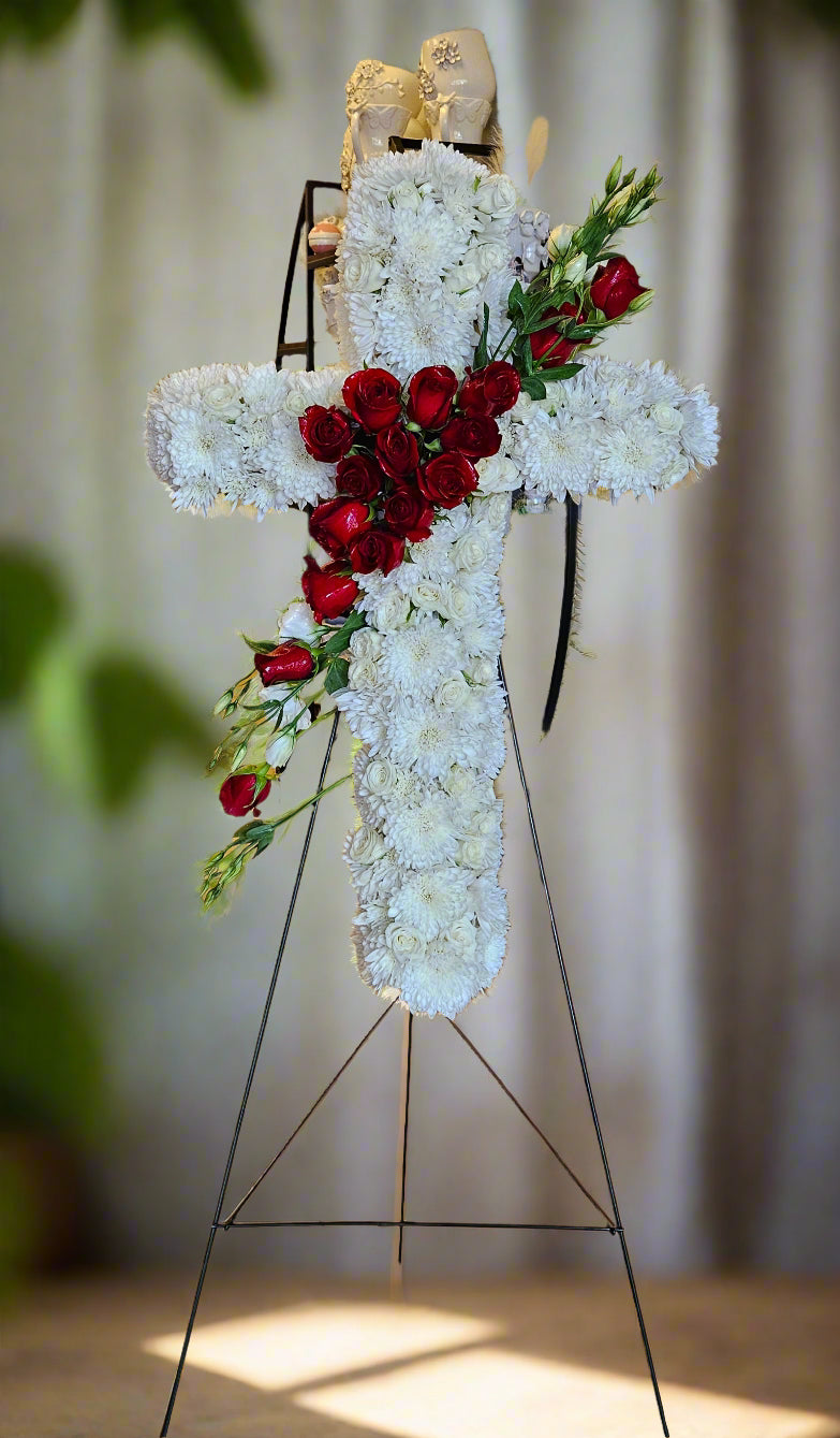 This elegant cross easel arrangement symbolizes faith, peace, and the beauty of a life remembered. Soft, graceful blooms gently drape the form of the cross, offering a heartfelt tribute to a soul at rest. Graceful on the Cross honors spiritual strength, everlasting love, and the comfort of a peaceful passing.